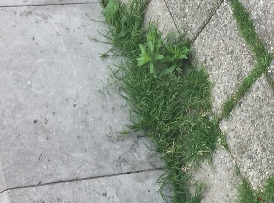 Ook aan 't Sprinkhaantje groeit het onkruid aan de voorgevel  zo hoog dat het een gemeentelijk gebouw onwaardig is.